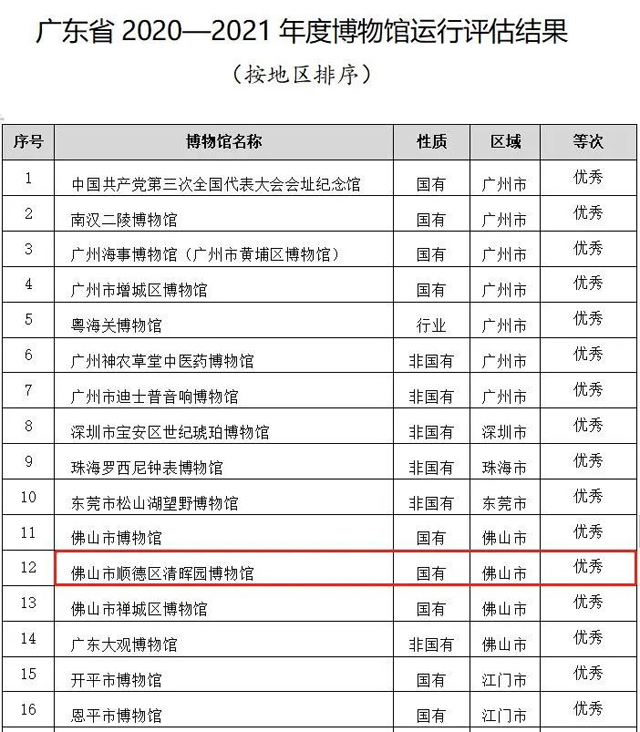 近日,在广东省文化和旅游厅公布的2020-2021年度全省博物馆运行评估结果中,清晖园博物馆被评为优秀等次。