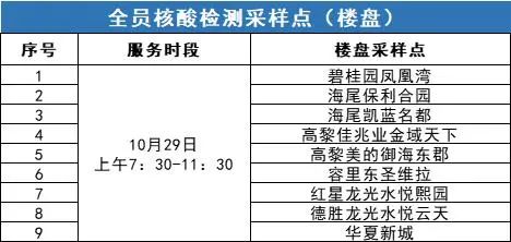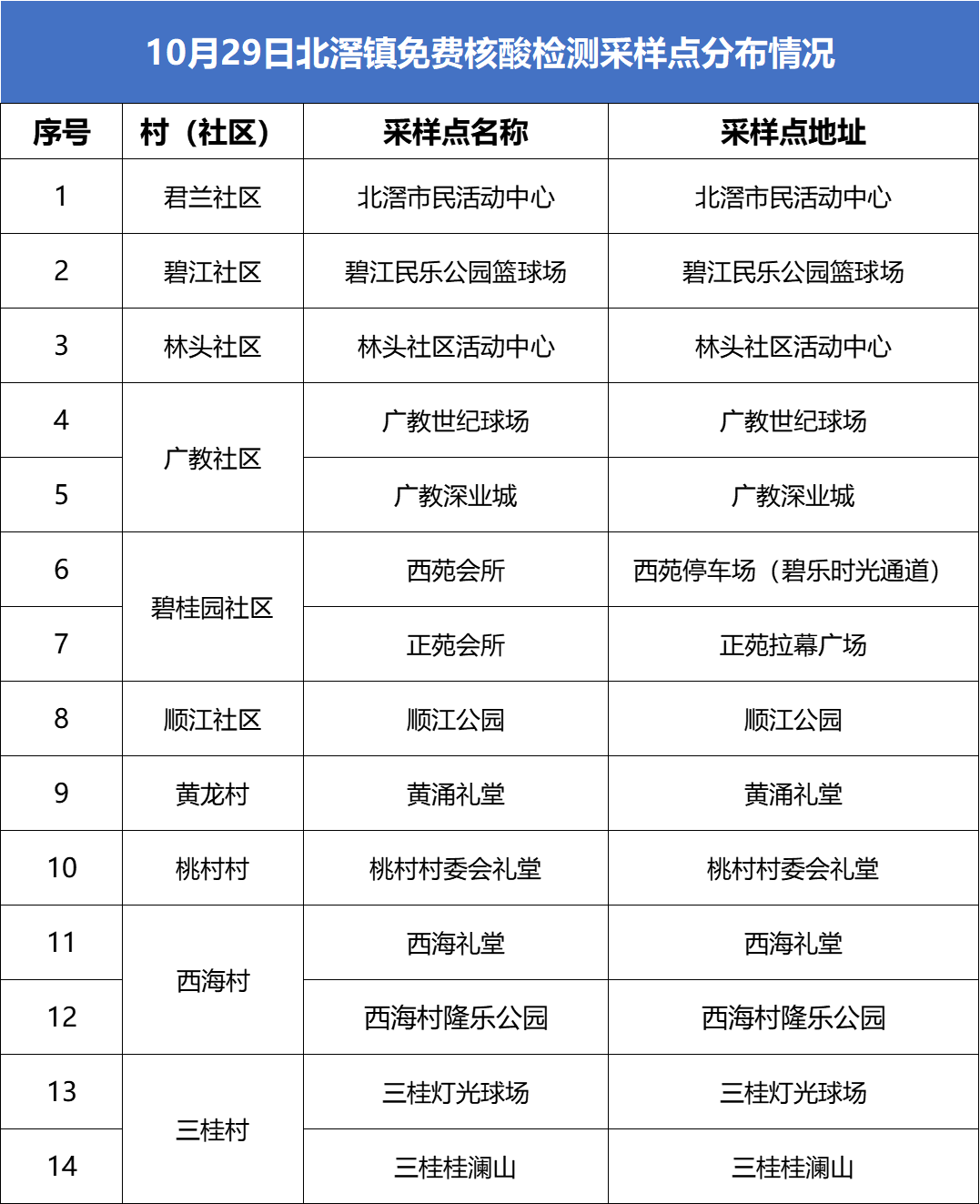 当前,疫情防控形势严峻复杂,为进一步强化新冠肺炎疫情防控管控措施,切实保障广大人民群众身体健康和生命安全,根据上级疫情防控工作安排,北滘镇现定于10月29日(星期六)7:30-12:00,预计4.5小时,在君兰、碧江、林头、广教、碧桂园、顺江、黄龙、桃村、西海、三桂10个村(社区)范围内开展免费核酸检测服务(点位详情见后文表格)。现将有关事项通知如下: