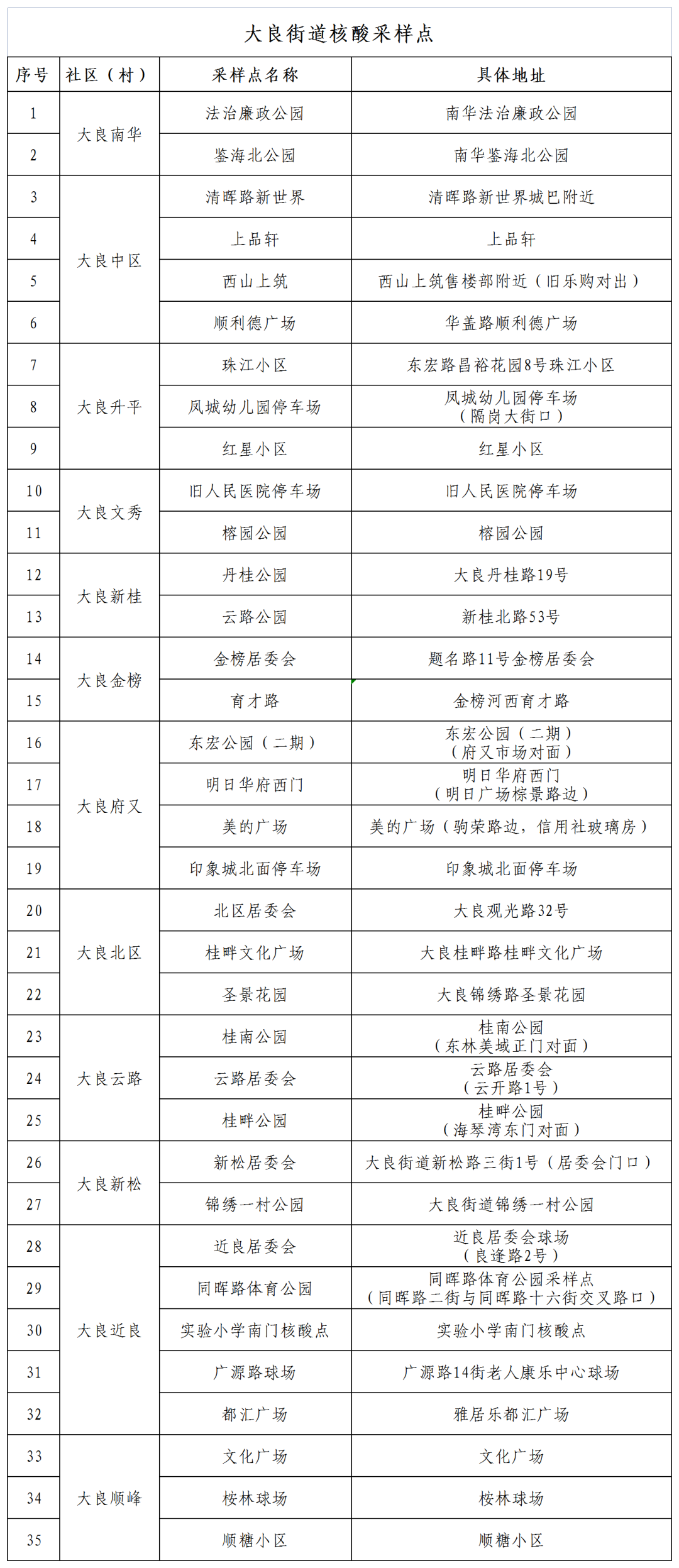 (三)大良街道所有核酸检测点均提供黄码人员核酸检测服务;红码人员请迅速联系所属村(社区)报备,请勿前往免费核酸检测点。