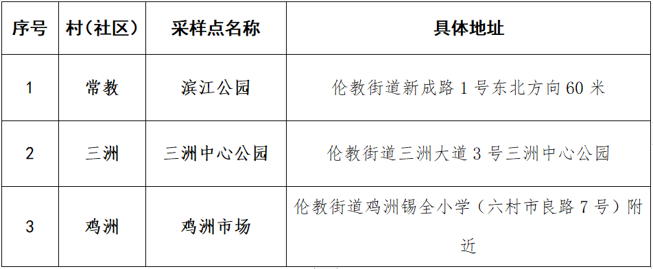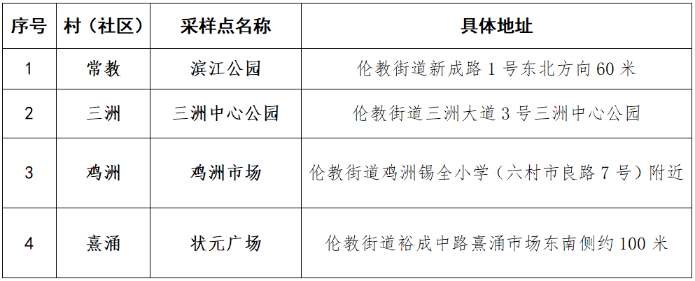 (一)2022年10月29日(星期六)8:30-12:00时,在常教社区、三洲社区、鸡洲村、熹涌村设4个采样点。