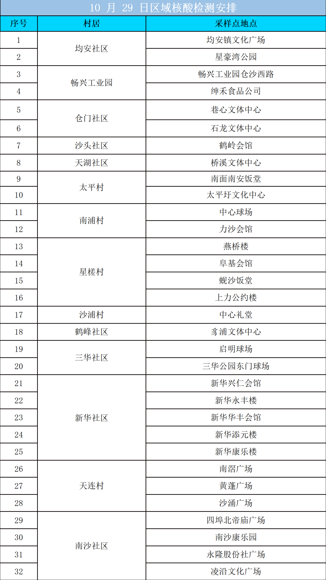 均安镇于10月29日上午8:00-11:00,下午5:30至晚上9:00时启动免费区域核酸检测,共设32个采样点,具体安排如下: