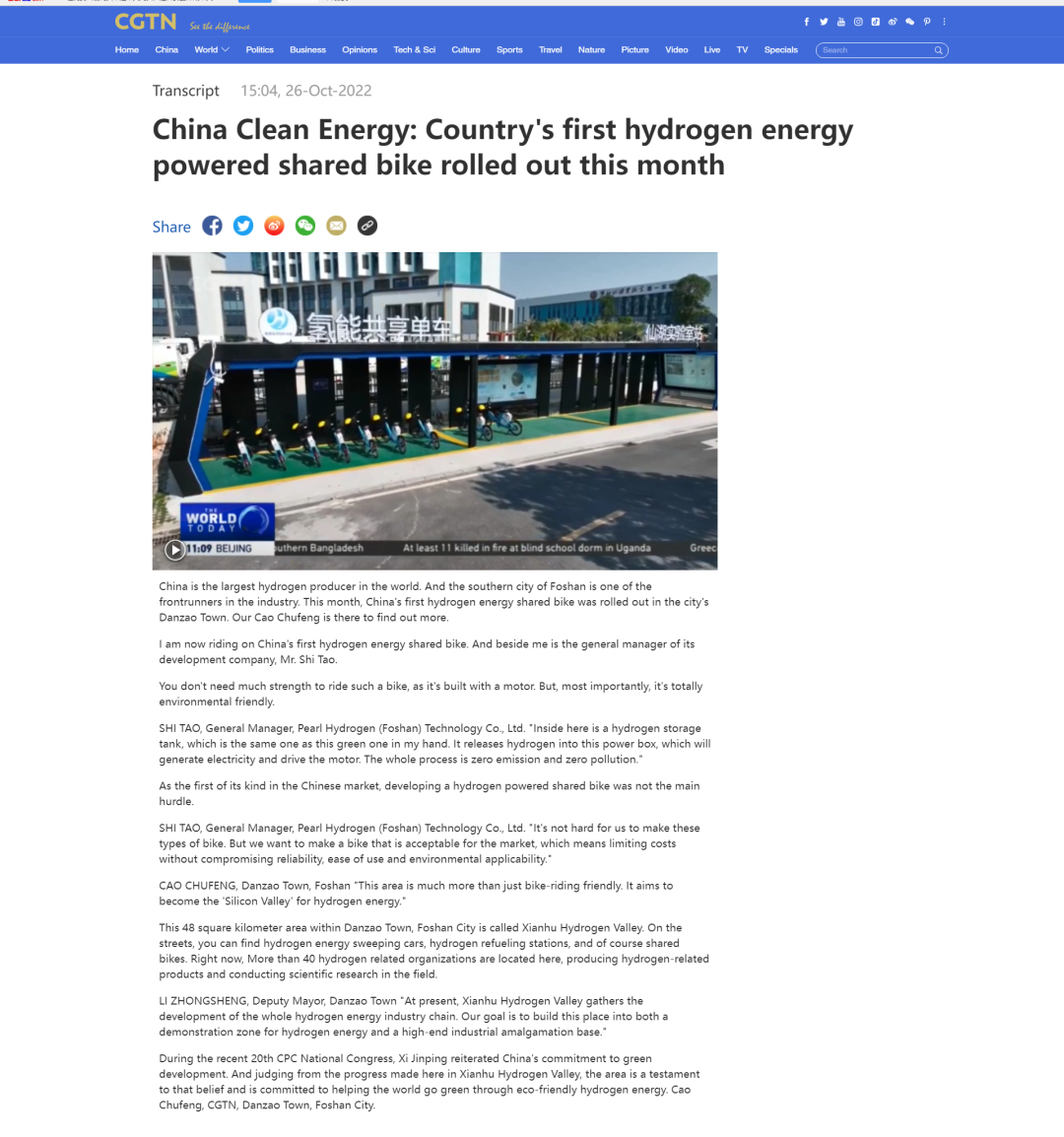 China is the largest hydrogen producer in the world. And the southern city of Foshan is one of the frontrunners in the industry. This month, China's first hydrogen energy shared bike was rolled out in the city's Danzao Town. Our Cao Chufeng is there to find out more.