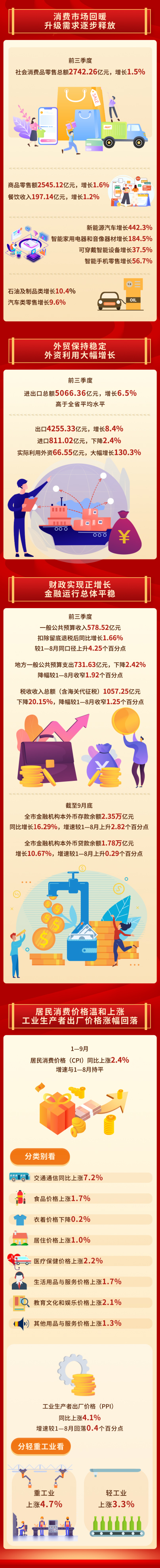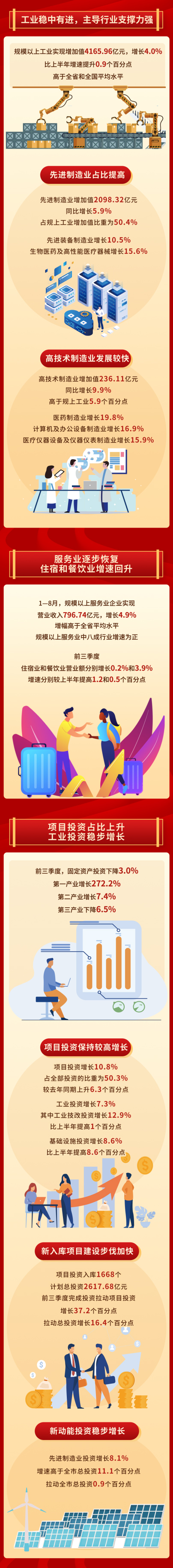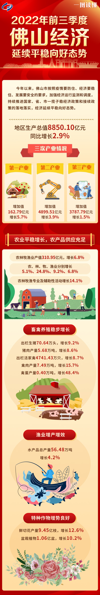 前三季度,根据广东省地区生产总值统一核算结果,全市地区生产总值为8850.10亿元,同比增长2.9%,比上半年上升0.1个百分点,增速在珠三角排名第3。其中,第一产业增加值162.79亿元,增长5.7%;第二产业增加值4899.51亿元,增长3.9%;第三产业增加值3787.79亿元,增长1.5%。
