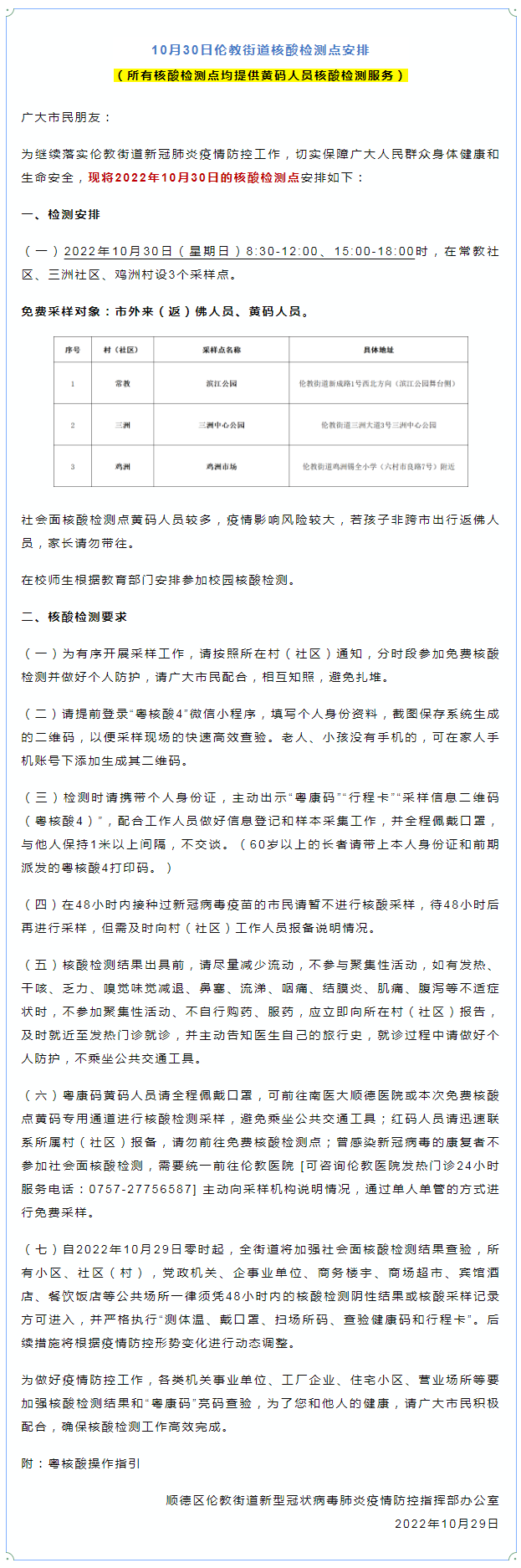 七、10月30日勒流街道所有外市来(返)佛便民核酸采样点将暂停开放。