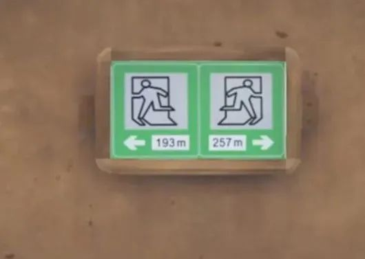 设置于隧道两侧墙上,每隔50米设置一处,标志上两侧数字代表距两侧疏散通道的长度,逃生时可根据疏散标志上的指示,向最近的疏散通道或出口逃生。