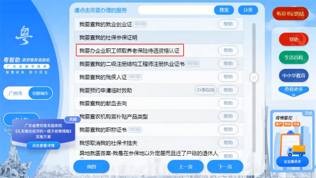 “粤智助·政府服务自助机”于2022年1月28日上线城乡居民养老待遇资格认证和认证查询功能。据统计,全省每10人就有1人使用过“粤智助”,其中60岁以上长辈群体超过300万。为更好服务老年人,“粤智助”政府服务自助机逐步完善涉及老人办理的服务事项,目前全新上线以下功能:企业职工养老待遇资格认证、企业职工养老保险资格认证查询。