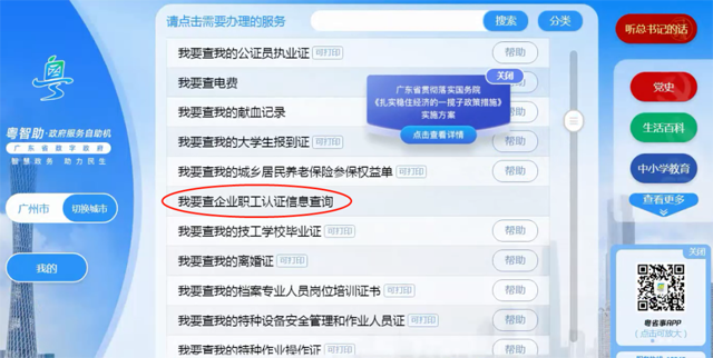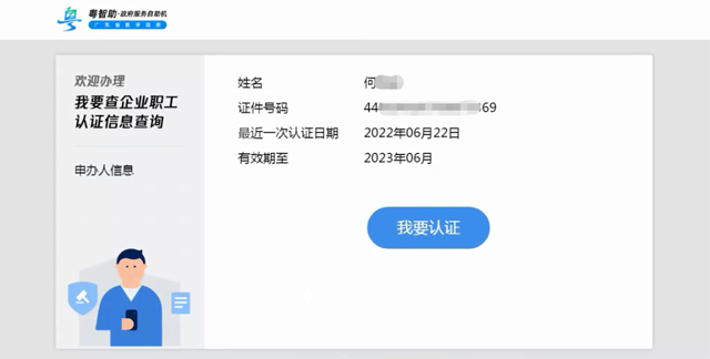 操作步骤:在首页界面点击【省垂事项】进入到【粤智助】事项界面,点击【我要查企业职工认证信息查询】,刷身份证,即可查看最近一次认证时间和有效期。