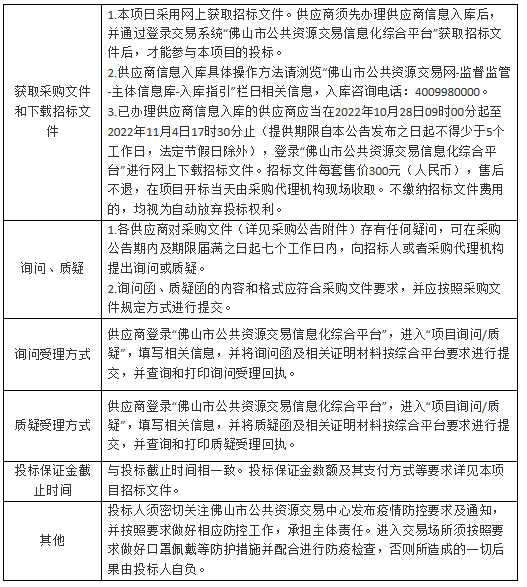 1.本项目采用电子系统进行招投标,请在投标前详细阅读供应商操作手册,手册获取网址:https://gdgpo.czt.gd.gov.cn/help/transaction/download.html。投标供应商在使用过程中遇到涉及系统使用的问题,可通过020-88696588 进行咨询或通过广东政府采购智慧云平台运维服务说明中提供的其他服务方式获取帮助。