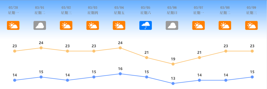 预计28日-3月1日白天云量增多,早晚气温继续回升,1日夜间-2日弱冷空气影响。未来2日早晚有轻雾或轻微灰霾,能见度较差,需注意水陆交通安全;昼夜温差大,请注意适时添减衣物。