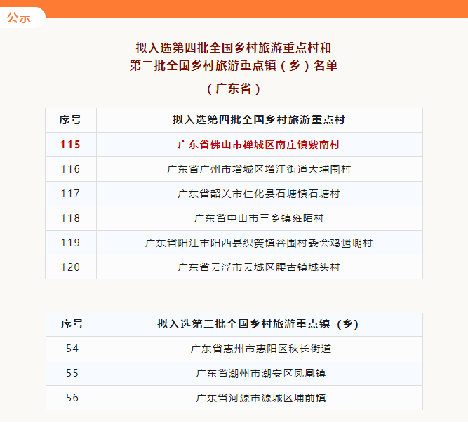 近日,文化和旅游部官网发布关于第四批全国乡村旅游重点村名单和第二批全国乡村旅游重点镇(乡)名单的公示,禅城区南庄镇紫南村入选。