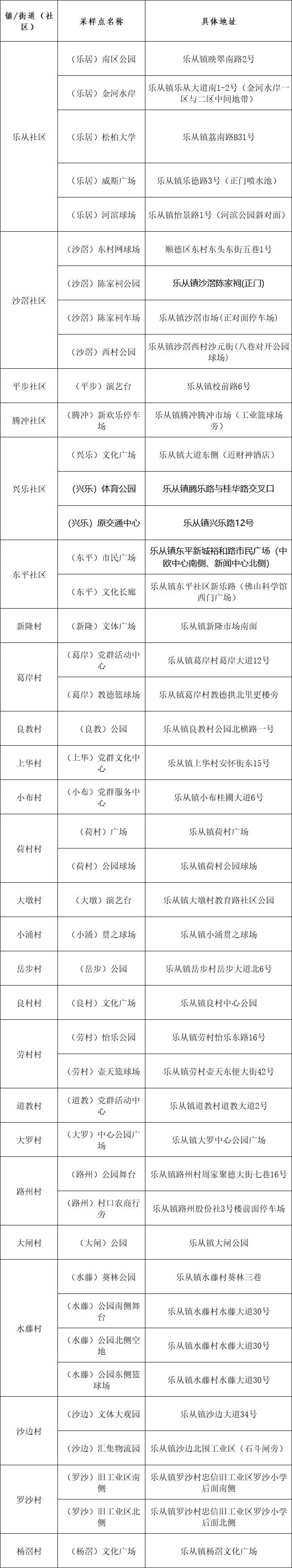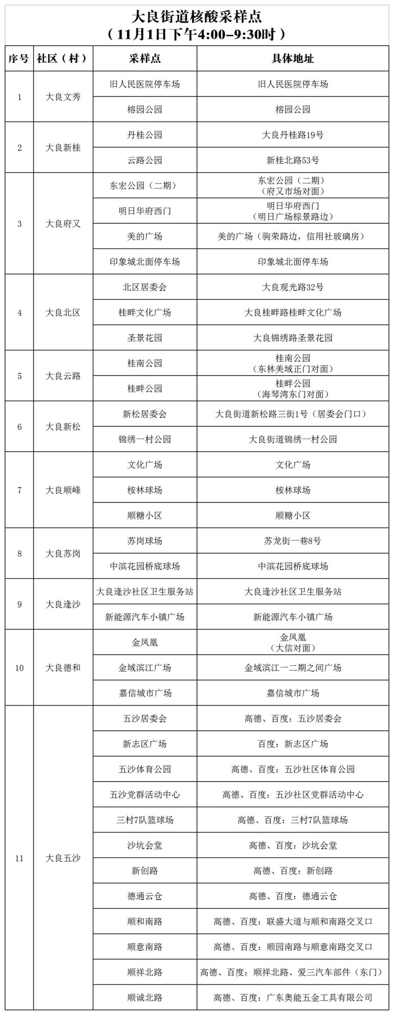 (二)11月1日下午4:00-9:30时:文秀、新桂、府又、北区、云路、新松、顺峰、苏岗、逢沙、五沙、德和等社区(村)开展全员核酸采样检测。