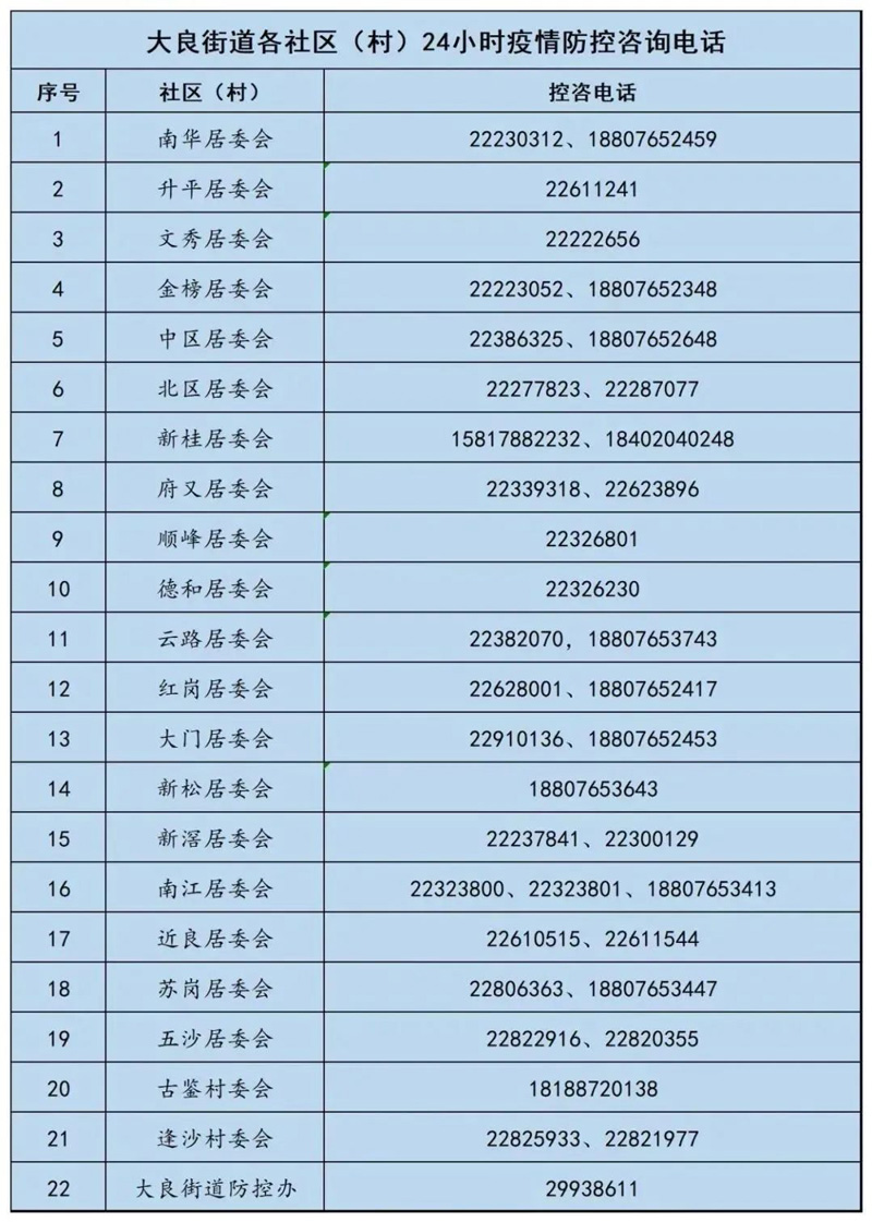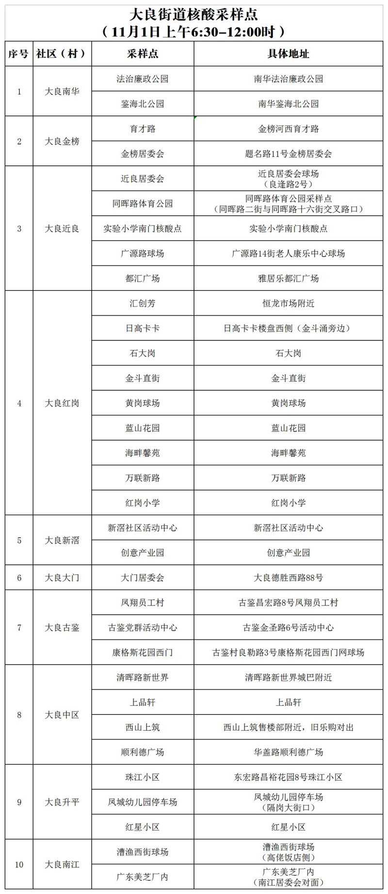 (一)11月1日上午6:30-12:00时:南华、中区、升平、金榜、新滘、近良、南江、红岗、大门、古鉴等社区(村)开展全员核酸采样检测;