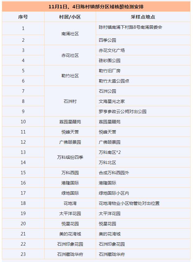 目前,陈村镇暂未出现新冠肺炎疫情,但考虑到近期广州市防控形势复杂严峻,为切实保障群众的身体健康,现定于11月1日、4日在镇内临近广州市的村居、小区开展核酸检测。现将有关事项通知如下:
