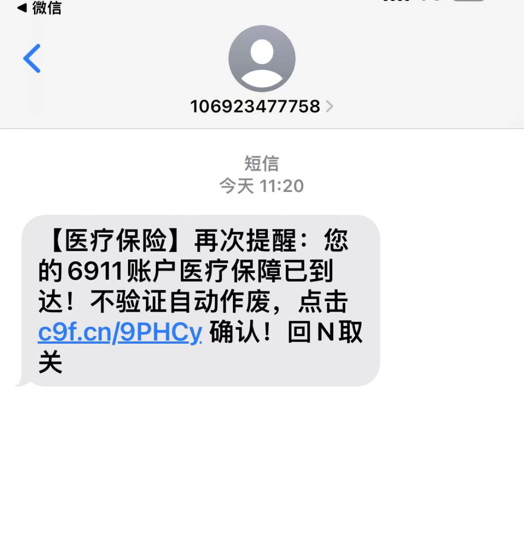 近日,市民反映收到“医疗保险”短信,内容为“再次提醒:您的6911账户医疗保障已到达!不验证自动作废,点击c9f.cb/.xxxxx”确认!”此信息为虚假信息,请市民提高警惕,勿传勿信。