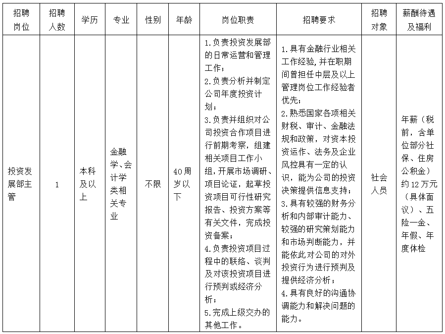 佛山市三水区南山公有资产投资管理有限公司(下称南山公投公司)因业务发展需要,诚向社会公开招聘工作人员1名,有关事项公告如下:
