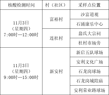 为进一步强化新冠肺炎疫情防控管控措施,切实保障广大人民群众身体健康和生命安全,根据上级疫情防控工作安排,现定于2022年11月3日在富裕村、连杜村、新安村范围内开展免费核酸检测(具体时间详见附件)。现将有关事项通知如下: