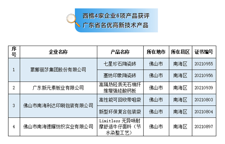 为了展示广东省高新技术企业发展成果,树立优秀榜样、宣传优质产品,推动广大高新技术企业加强科技创新,2021年广东省高新技术企业协会组织开展了广东省名优高新技术产品评选工作。其中,西樵有4家企业6项产品获评2021年广东省名优高新技术产品!