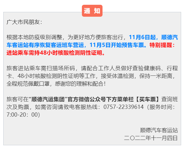 据顺德汽车客运站消息,11月6日起,顺德汽车客运站有序恢复客运班车营运。(特别提醒:进站乘车需持48小时核酸检测阴性证明。)