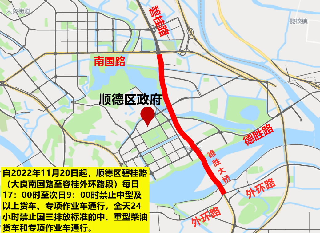 为改善碧桂路交通通行环境,经区政府有关部门研究,决定从2022年11月20日起,对顺德区碧桂路(大良南国路至容桂外环路)实施货车禁行交通管制措施,具体如下: