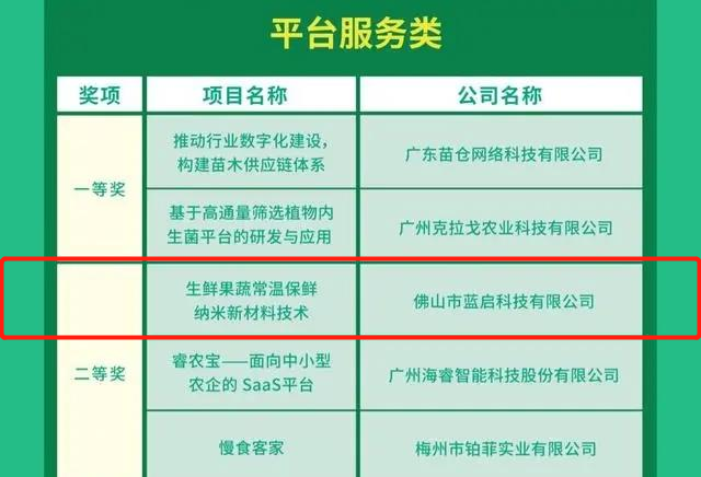经过激烈角逐,最终,来自南海丹灶的佛山市蓝启科技有限公司的生鲜果蔬常温保鲜纳米材料新技术项目获得本次大赛平台服务类第三名(二等奖)。