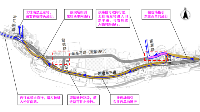 03、取消临时路(与前进路衔接路段)通行,车辆绕行新建东平路。