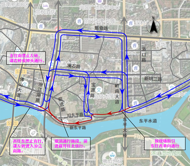 02、东平路西往东方向行驶至东平路/汾江南路交叉口处禁止直行,请左转绕行澜石路或魁奇路通行。