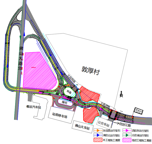 对文昌西路(佛山火车站路段)进行围蔽,文昌西路环岛东侧局部道路由现状东西双向6车道调整为双向4车道。