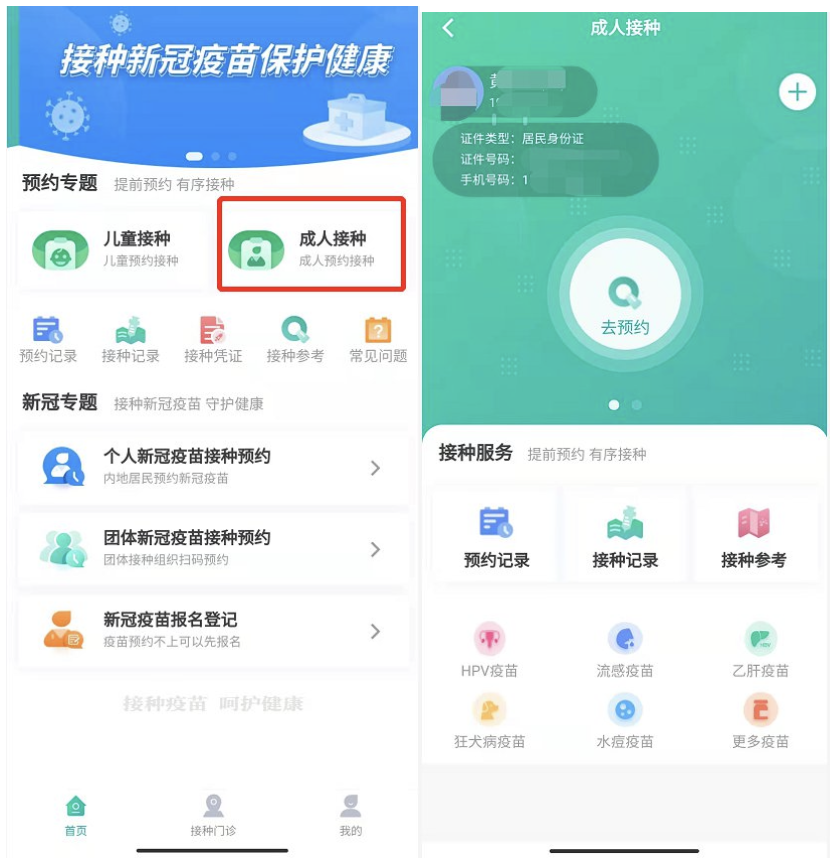 2、选择【成人接种】进入接种列表,选择【添加成人】按钮,输入相关信息添加,添加后点击【去预约】