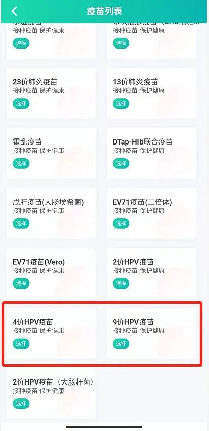 3、选择疫苗,点击【4价HPV疫苗】或【9价HPV疫苗】,下一步,开始预约。