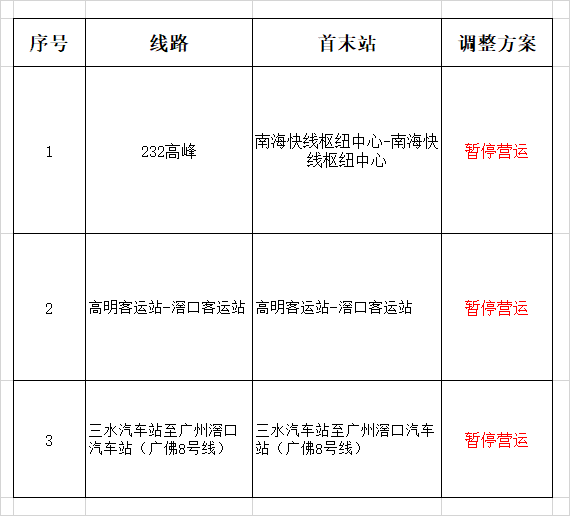 二、公交232高峰线、高明客运站-滘口客运站、三水汽车站至广州滘口汽车站(广佛8号线)等3条公交线路暂停运营(详见下表)。