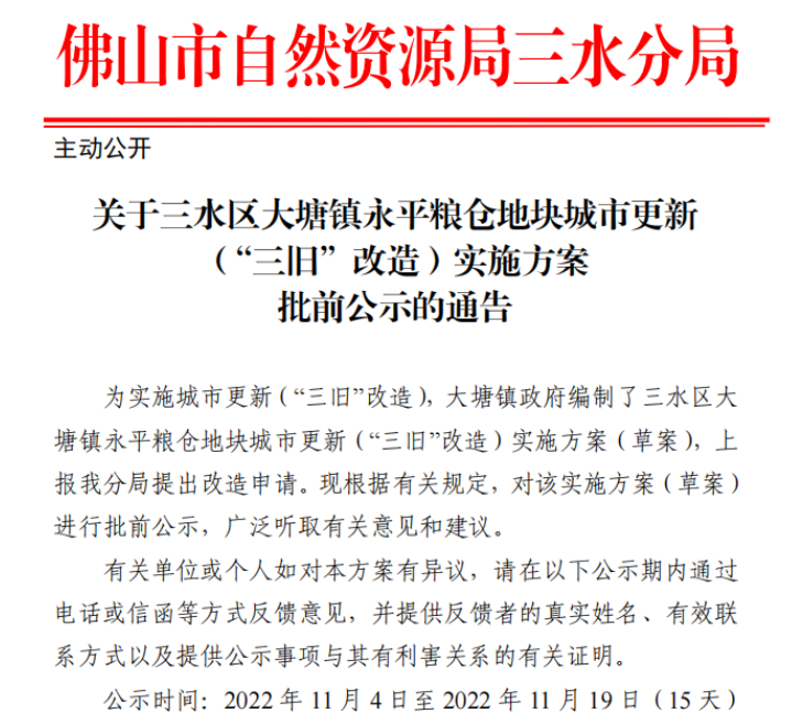 11月9日,记者从佛山市自然资源局三水分局获悉,三水区拟启动大塘镇永平粮仓地块城市更新“三旧”改造项目。大塘镇永平粮仓地块拟改造成农贸市场、购物中心、服务型公寓,提升片区生活质量的同时,也促进工业园区有序发展。