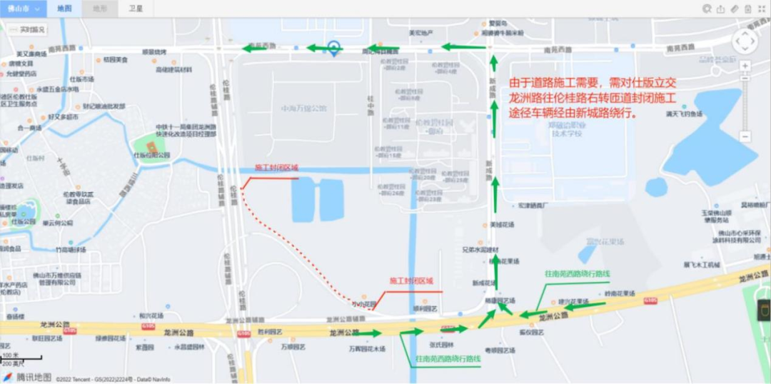 因龙洲路快速化改造工程(伦桂路节点)项目施工需要,现对龙洲路(东往西)往伦桂路辅道右转匝道(往南苑西路、滨江西路方向)进行封闭施工,工期42天(于2022年11月20日至2022年12月31日)。