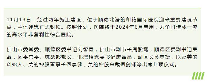 和祐国际医院项目源于美的创始人何享健先生“造福桑梓、回馈社会”的公益初心,由美的控股出资超100亿元创办,地处粤港澳大湾区核心——佛山三龙湾高端创新集聚区,是广东省重点项目。