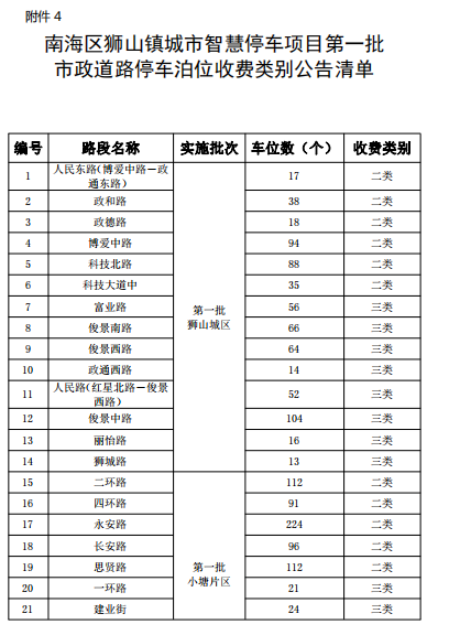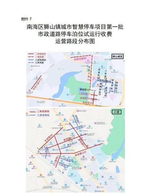 狮山镇已完成第一批共计1440个市政道路停车泊位的智能化改造及调试工作,其中二类收费路段11条,三类路段13条,2022年11月10日—12月31日实施试运行收费;