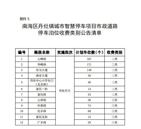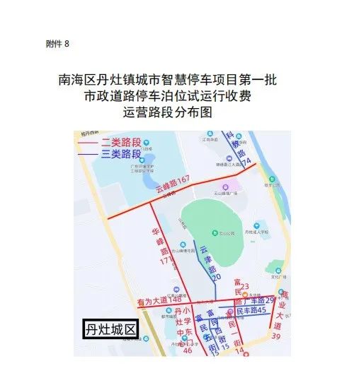 丹灶镇已完成第一批共计806个市政道路停车泊位的智能化改造及调试工作,其中二类收费路段7条,三类路段5条,2022年11月10日—12月31日实施试运行收费;