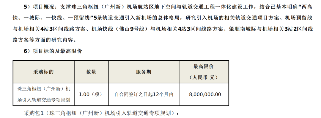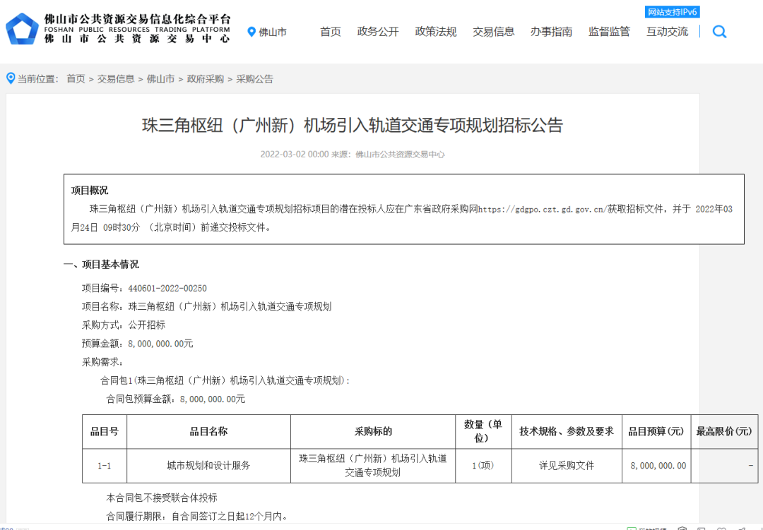 佛山市公共资源交易网公布《珠三角枢纽(广州新)机场引入轨道交通专项规划招标公告》截图。