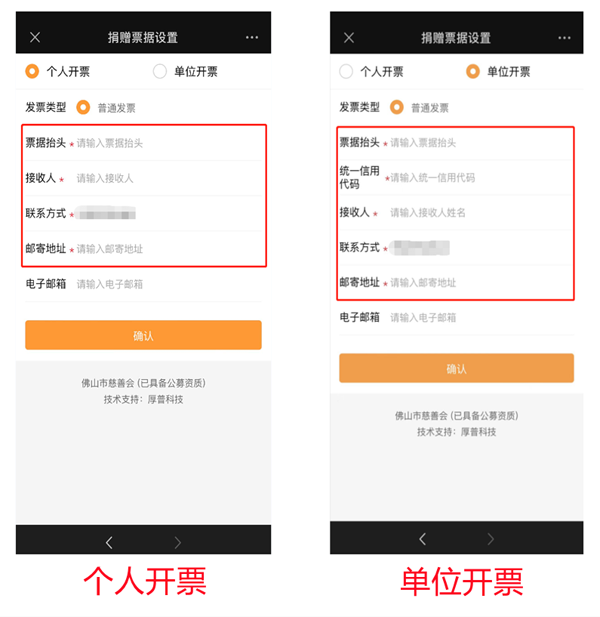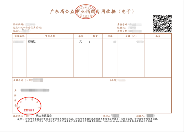 如需申请开具广东省公益事业捐赠统一票据(电子),请在【捐赠人】处填写与票据抬头一致的名称,且在联系方式填写可接收短信的手机号码,届时票据将以短信的形式发送至捐赠人手机(微信捐赠平台会默认使用微信名称,请注意修改)。
