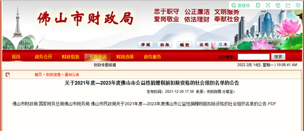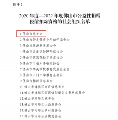 近日,佛山市财政局、国家税务总局佛山市税务局、佛山市民政局联合发布《关于2021年度—2023年度佛山市公益性捐赠税前扣除资格的社会组织名单的公告》(佛财公告〔2021〕2号),其中,佛山市慈善会获得2020年度—2022年度公益性捐赠税前扣除资格!