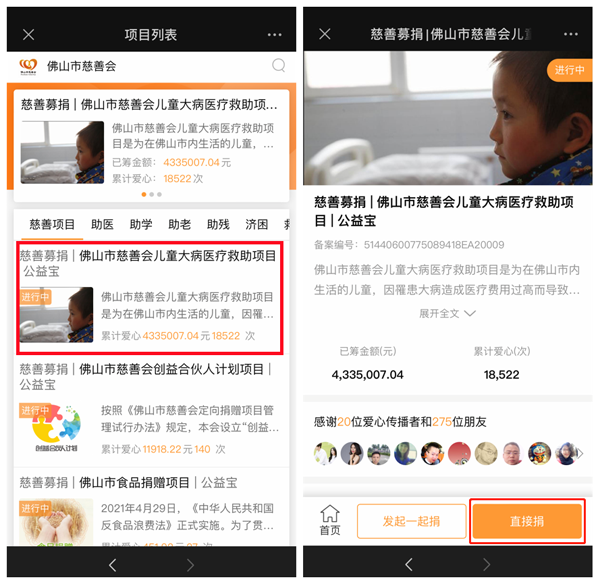 3、选择你想要捐赠的慈善项目,在项目捐赠页面点击【直接捐】或【发起一起捐】;