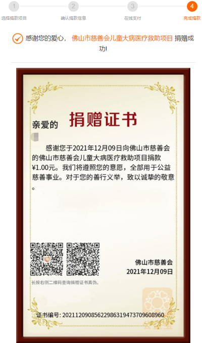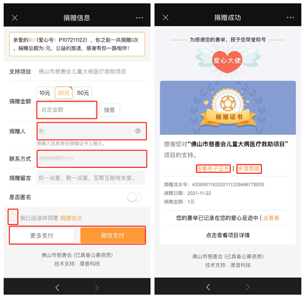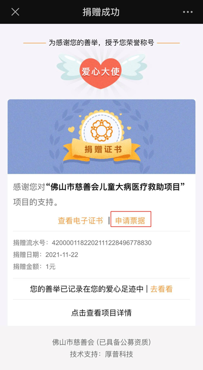 4、填写相关信息,包括捐赠金额、捐赠人、联系方式等,成功捐赠后将显示相关页面,可【查看电子证书】与【申请票据】。