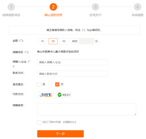 3、在项目捐赠页面填写相关信息,包括捐赠金额、捐赠人、联系方式等;
