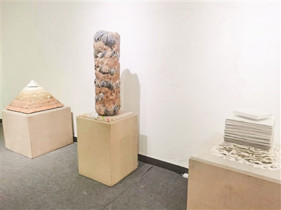 其中,《生命镜像》以盘腿而坐、互为镜像的一人一猴为主体造型,展现作者对人与自然和谐共生的思考。《溯源》创新利用磁悬浮技术,展现开放性的材料工艺和独特的视觉呈现,探索黏土语言和成型手法的边界。《变幻的花瓶》则把不同花瓶的横切面拼接在一块黏土上,通过重复的笔触和技巧达到质与美的平衡。
