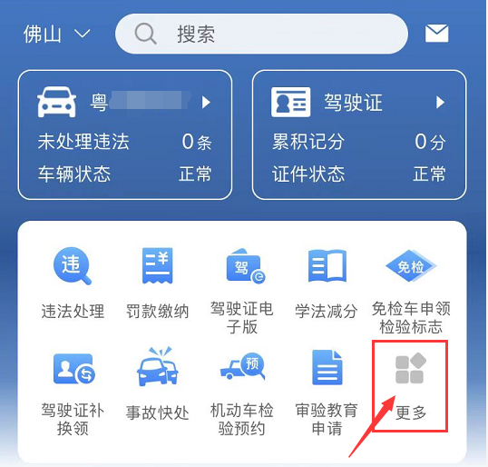 登录“交管12123”APP进入首页,点击【更多】进入业务办理页面。