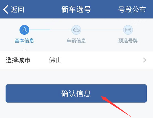 点击机动车业务中的【新车选号】,选择注册省市,并点击【确认信息】。