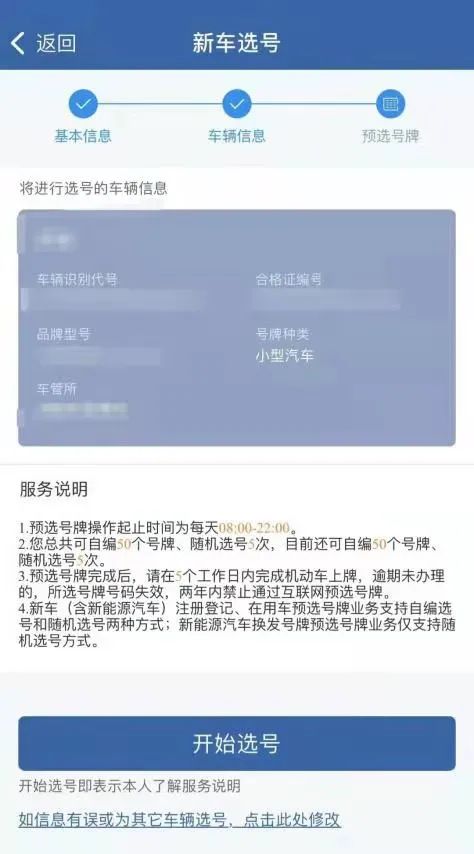 再次确认信息仔细阅读服务说明后,点击【开始选号】。