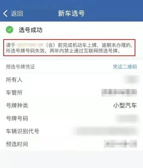 系统提示选号成功后,需在系统提示截至日期前及时到车管所办理注册登记业务。