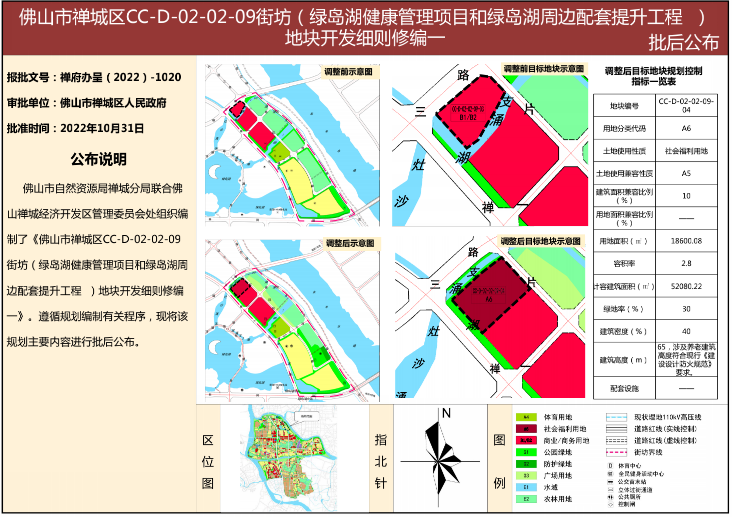 值得一提的是,就在11月9日,佛山市自然资源局刚刚发布《绿岛湖健康管理项目和绿岛湖周边配套提升工程地块开发细则修编》,将一商服用地变更调整为社会福利用地,正是此次出让地块所在。