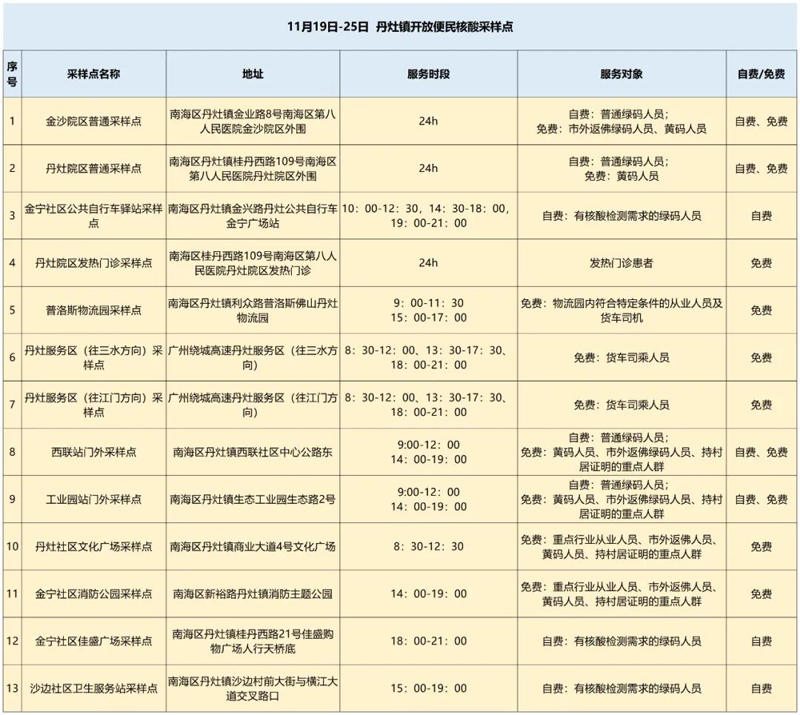 11月19日-11月25日,丹灶便民核酸采样点最新安排如下,有需要的街坊可就近前往。