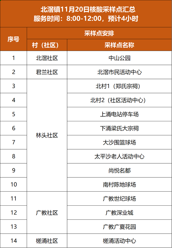 2. 11月20日上午8:00-12:00,北滘镇林头、北居、君兰、广教、槎涌5个村(社区)开展免费核酸检测。
