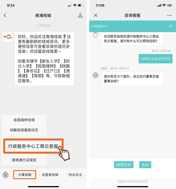 “工商云客服平台相当于把线下咨询搬到了线上,企业可以在线获取人工服务,确认所需填写的资料及细节,大大提高后续办理效率”。行政服务中心工作人员呼吁企业、个体工商户关注南海桂城微信公众号,在线解决办理疑问。